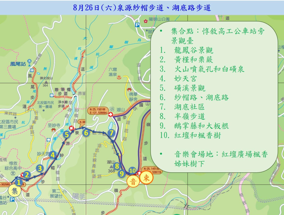 - 活動路線:惇敘工商公車站旁景觀臺(起點)→泉源路往龍鳳谷步道口→噴氣孔和白磺泉引水區→福德宮廟→妙天宮→磺溪和野溪溫泉遺跡→紗帽路、湖底路→湖底社區→半嶺步道→紅壇廣場楓香姊妹樹(終點)
