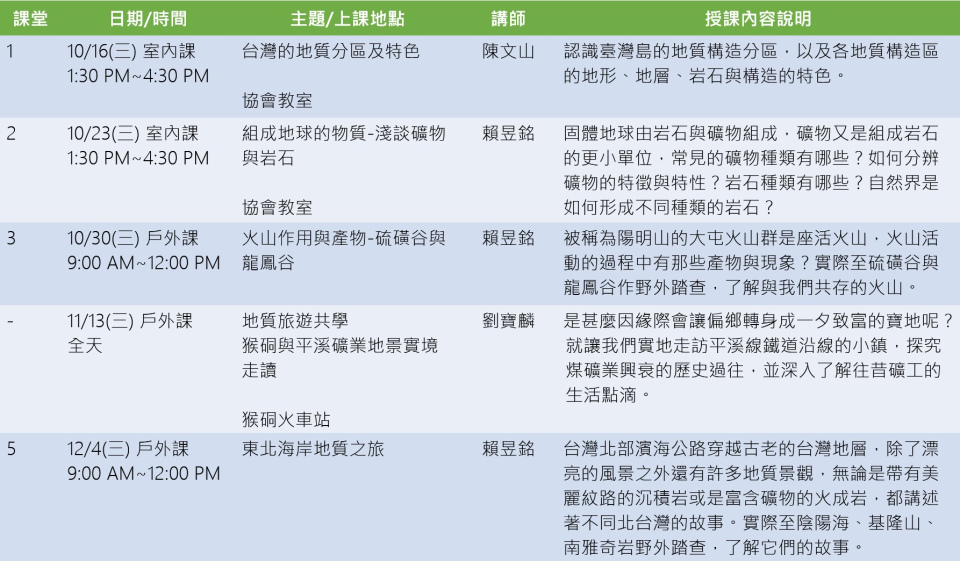 台灣北部濱海公路穿越古老的台灣地層,除了漂亮 的風景之外還有許多地質景觀,無論是帶有美麗紋 路的沉積岩或是富含礦物的火成岩,都講述著不同 北台灣的故事。實際至陰陽海、基隆山、南雅奇岩 野外踏查,了解它們的故事。 |