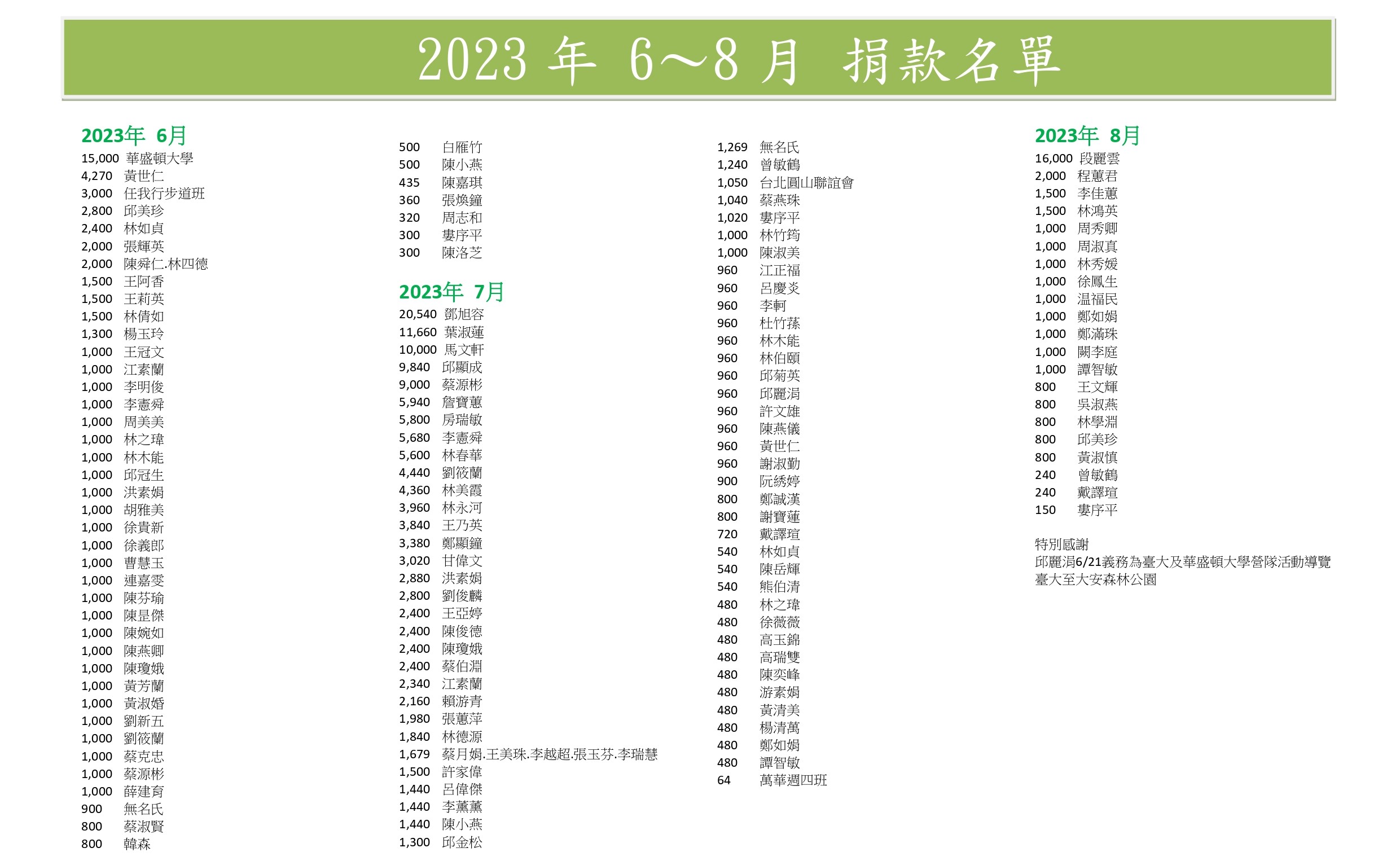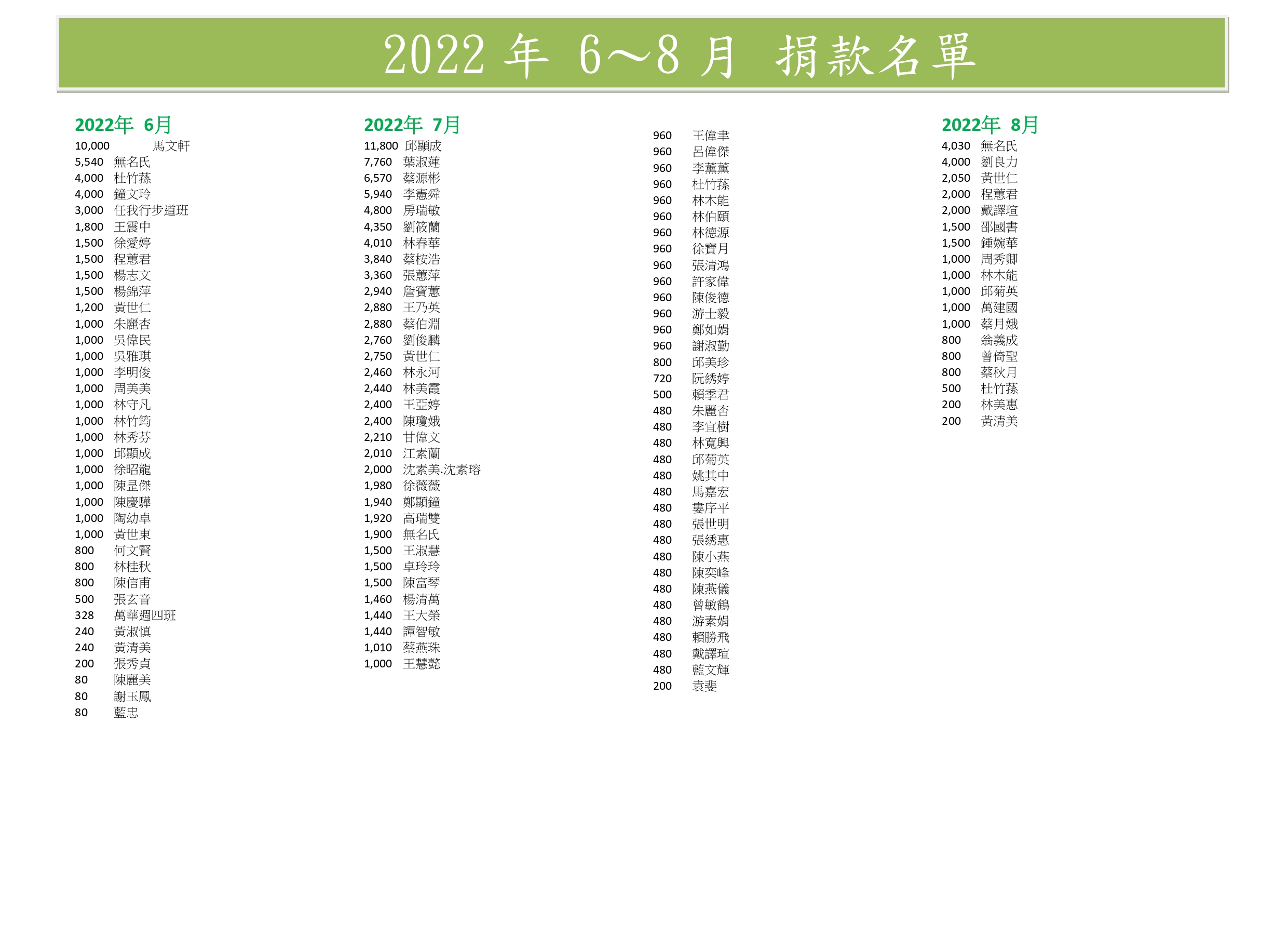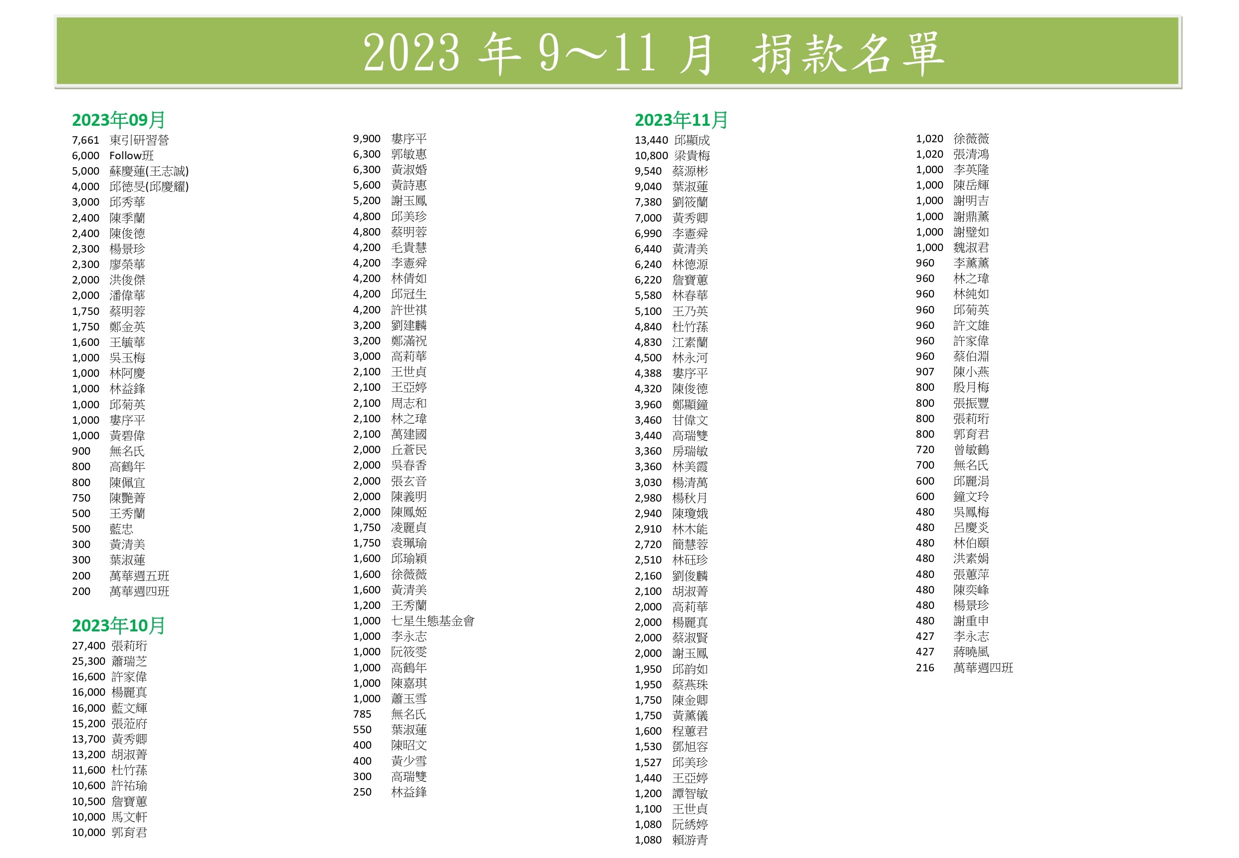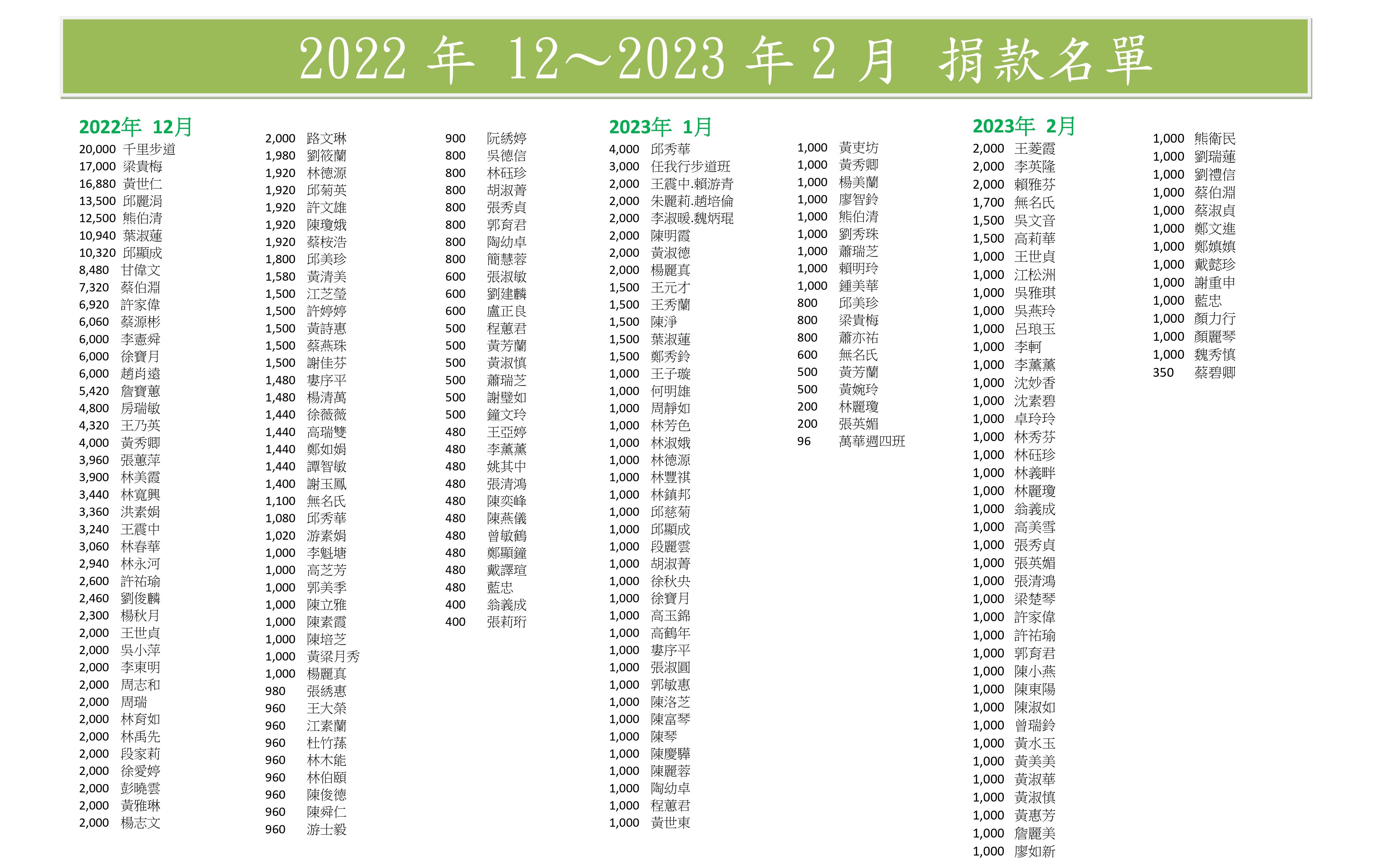 (以下表單為秘書處每季或年 公告捐款人名單及金額)